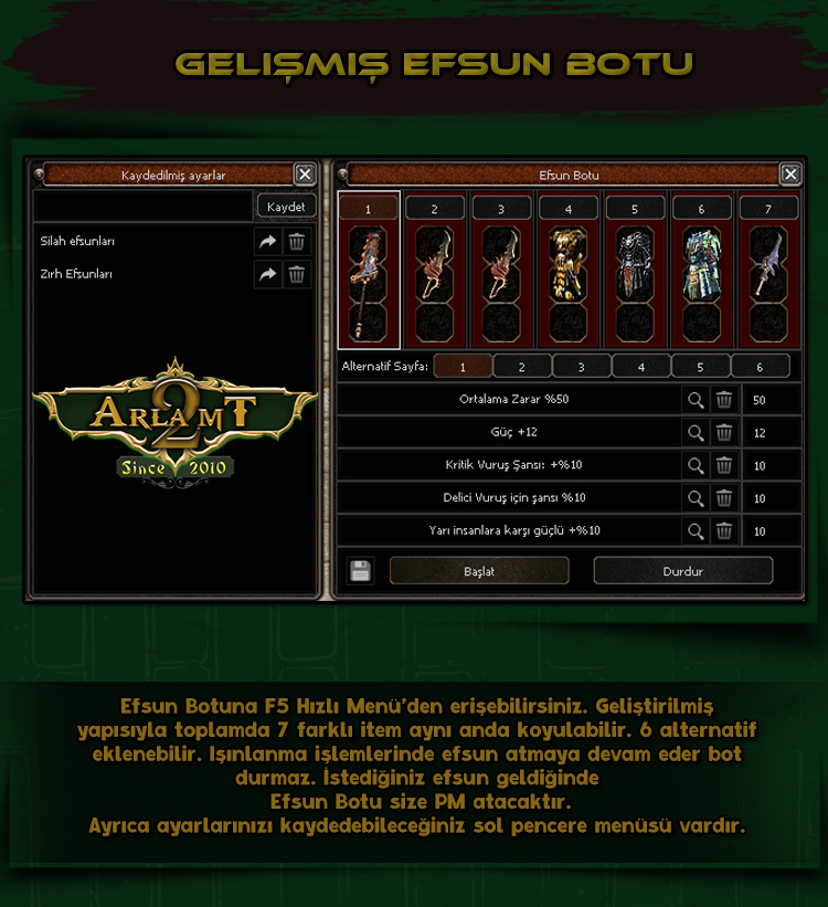 ArlaMt2 Gelişmiş Efsun Botu, F5 Hızlı Menü üzerinden erişilir. Toplamda 7 farklı item aynı anda işleme alabilir ve 6 alternatif efsun eklenebilir. Işınlanma işlemleri sırasında bot durmaksızın efsun atmaya devam eder. İstediğiniz efsun başarıyla geldiğinde, bot size PM (özel mesaj) göndererek bildirimde bulunur