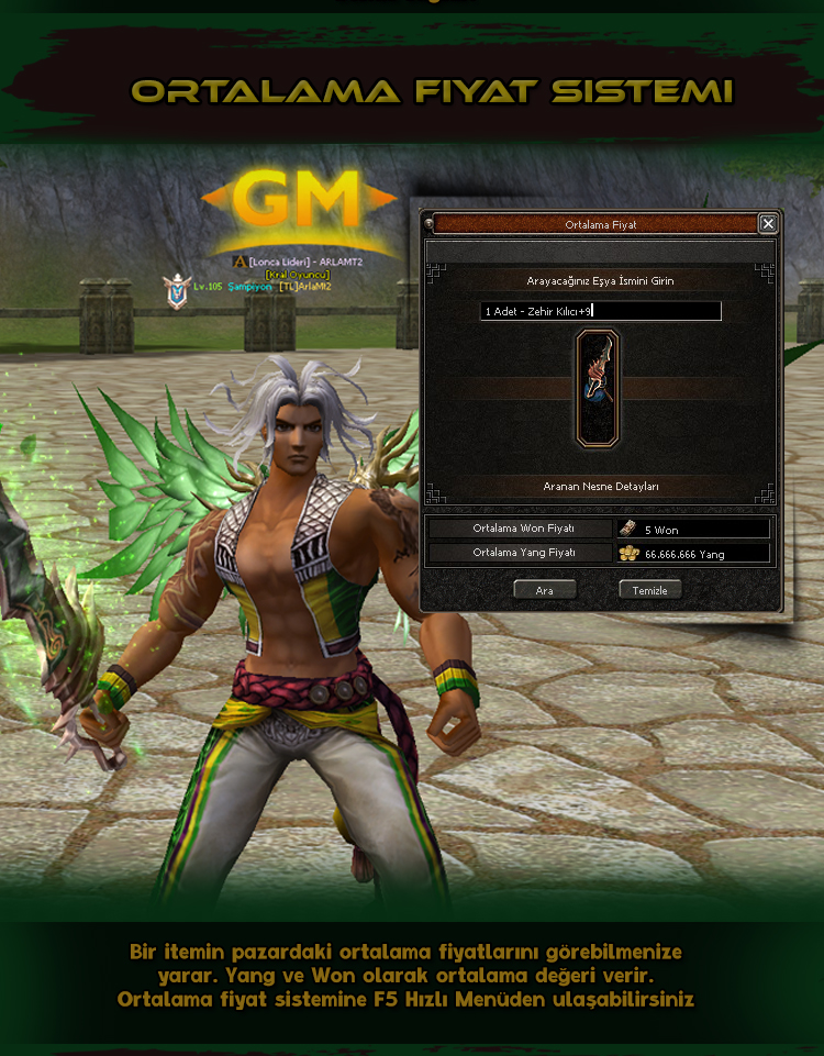 ArlaMt2 Ortalama Fiyat Sistemi, pazardaki bir itemin ortalama fiyatlarını görmenize olanak tanır. Yang ve Won olarak itemin ortalama değeri size sunulur. F5 Hızlı Menü üzerinden kolayca erişilebilen bu sistem, ticaret yaparken doğru fiyatlandırma yapmanıza yardımcı olur