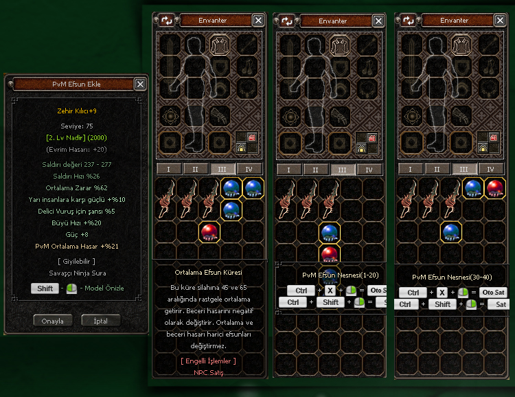 PvM Ortalama Hasar efsundan bağımsız olarak eşyaya eklenir. 3 farklı nesne ile 1-20, 20-30 ve 30-40 arası bonus getirilebilir. Sadece silahlara basılabilir. Ortalama Hasar Küresi : Bu küre sayesinde iteme 45 ve 65 arasında ortalama zarar efsunu gelebilir. Ortalama ve beceri efsunları harici efsun değiştirmez. Beceri Efsun Küresi : Bu küre sayesinde iteme 5 ve 25 arasında beceri hasarı efsunu gelebilir. Ortalama ve beceri efsunları harici efsun değiştirmez.
